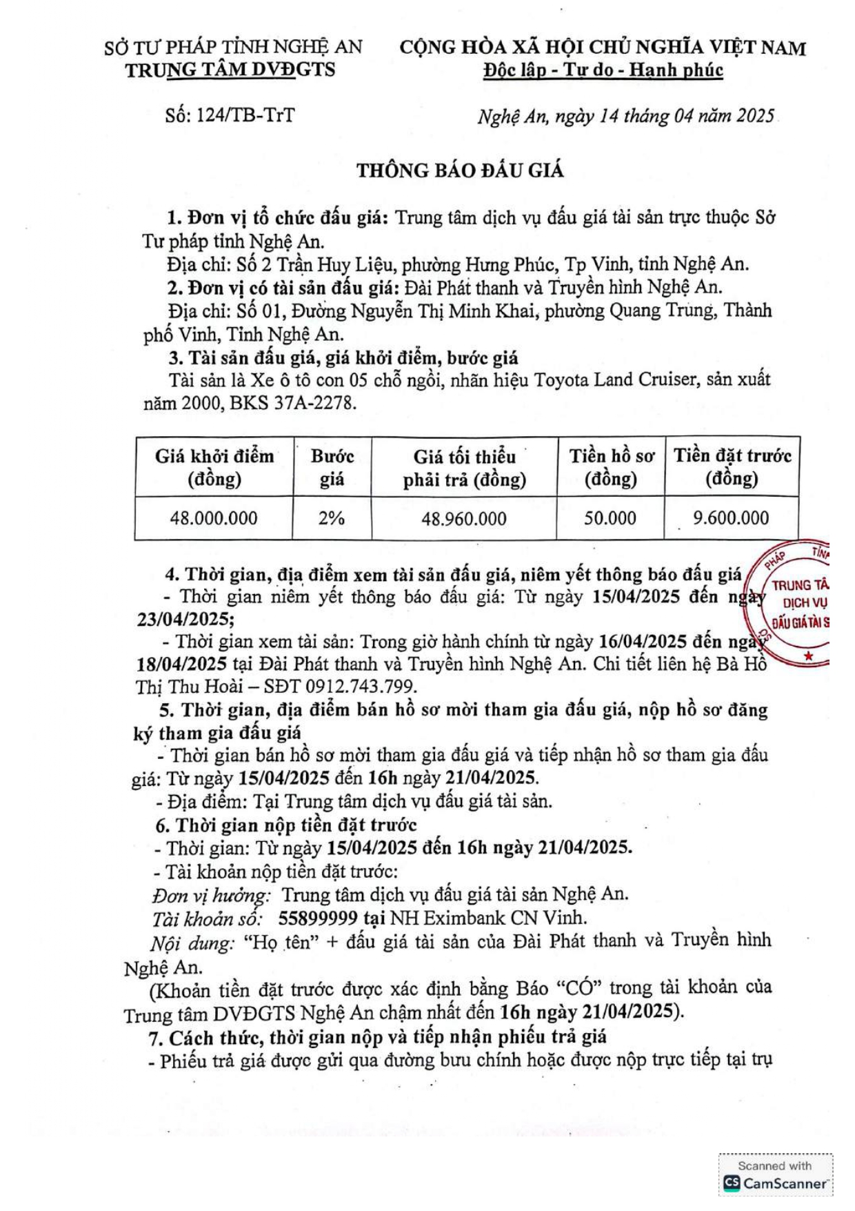 Thông báo 124: Tài sản là Xe ô tô con 05 chỗ ngồi, nhãn hiện Toyota Land Cruiser, sản xuất năm 2000, BKS 37A-2278