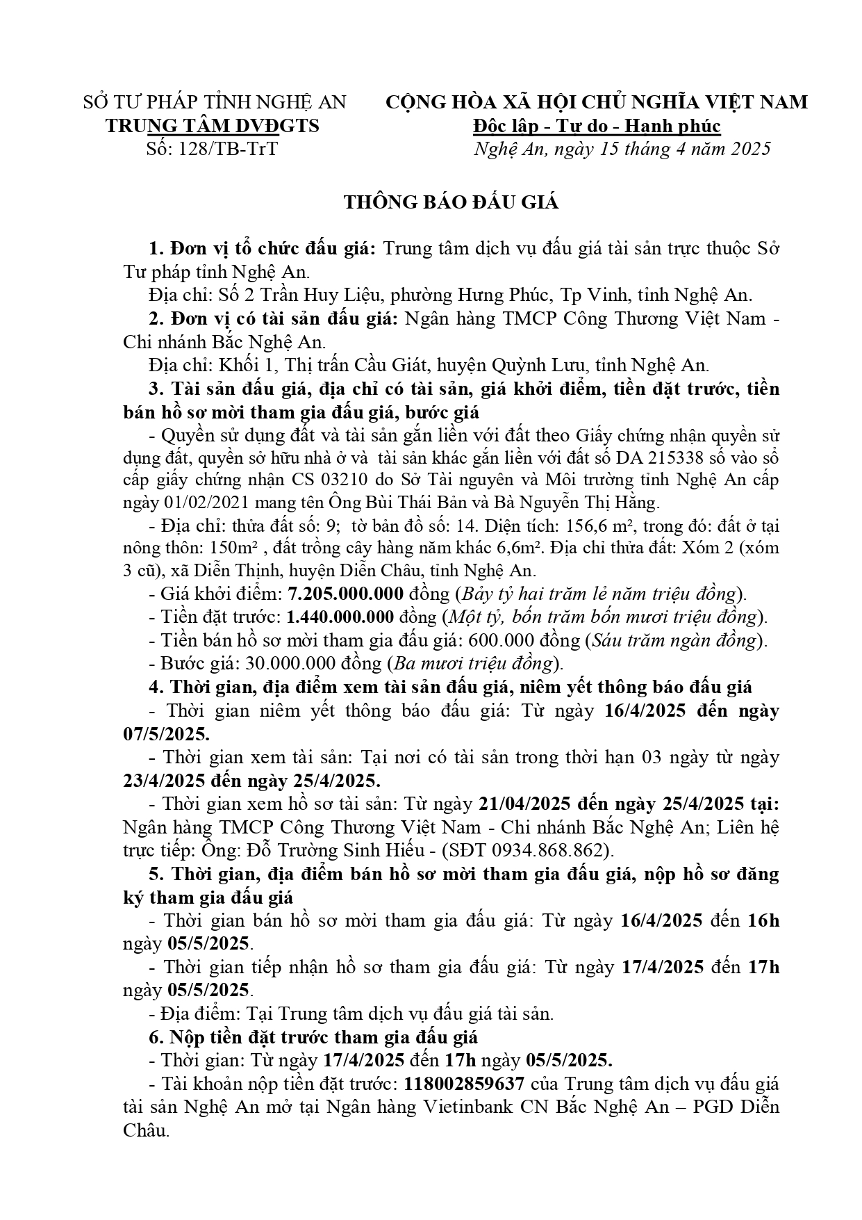 Thông báo 128: Quyền sử dụng đất có thửa đất số: 9; tờ bản đồ số: 14. Diện tích: 156,6 m², trong đó: đất ở tại nông thôn: 150m² , đất trồng cây hàng năm khác 6,6m². Địa chỉ thửa đất: Xóm 2 (xóm 3 cũ), xã Diễn Thịnh, huyện Diễn Châu, tỉnh Nghệ An.