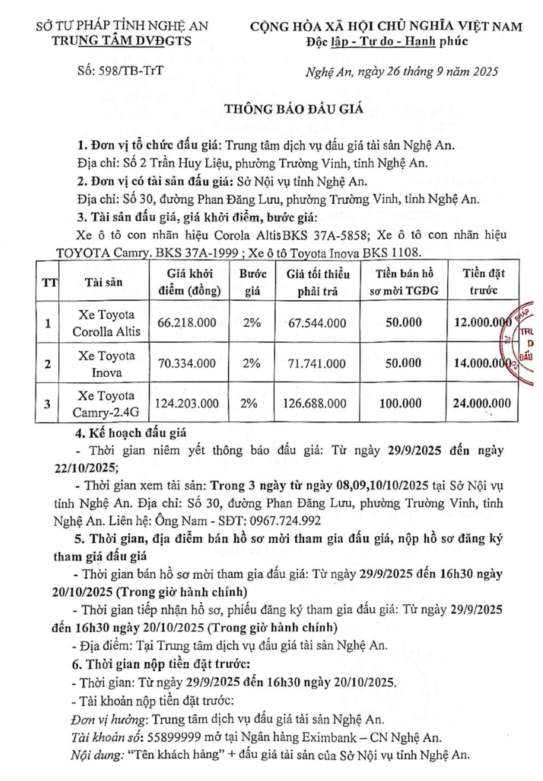 Thông báo 598 - 03 xe ô tô của Sở Nội vụ tỉnh Nghệ An